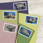The stamps showcase a gray-green Kemp??s ridley (Doug Perrine, photographer); a black and white leatherback (Rowan Byrne, photographer); an olive ridley (Solvin Zankl, photographer); a green sea turtle (David B. Fleetham, photographer); a mottled orange-brown loggerhead (James D. Watt, photographer); and a brownish-yellow hawksbill (Claudio Contreras, photographer).