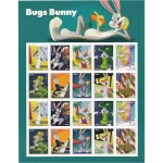About the Bugs Bunny set: Includes 10 stamp designs honoring Bugs Bunny’s debut in 1940, showcasing different personas.