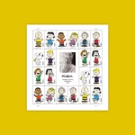 Designs: Feature 10 PEANUTS characters from Schulz’s existing artwork, with a central pane displaying a 1987 black-and-white photo of Schulz.