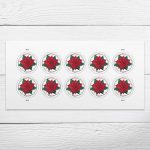 Stamp art features an overhead photo of a poinsettia, capturing the green leaves, red bracts, and yellow flowers at the plant’s center.