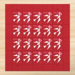 Geometric shapes come together to form a highly stylized white bird carrying a pink envelope sealed with a red heart.